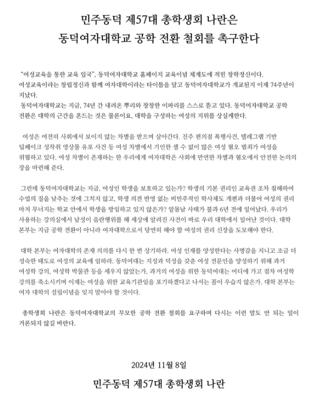 국내 4위 동덕 여대가 공학 전환이 되면 다른 여대들도 전환을 추친할 것이다.